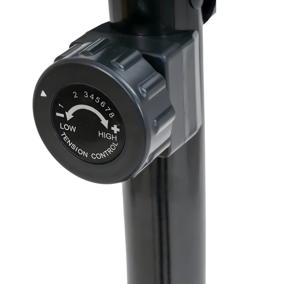 Su estructura vertical y plegable ocupa poco espacio, mientras que el asiento regulable, los pedales ajustables y las ruedas de transporte garantizan practicidad total.