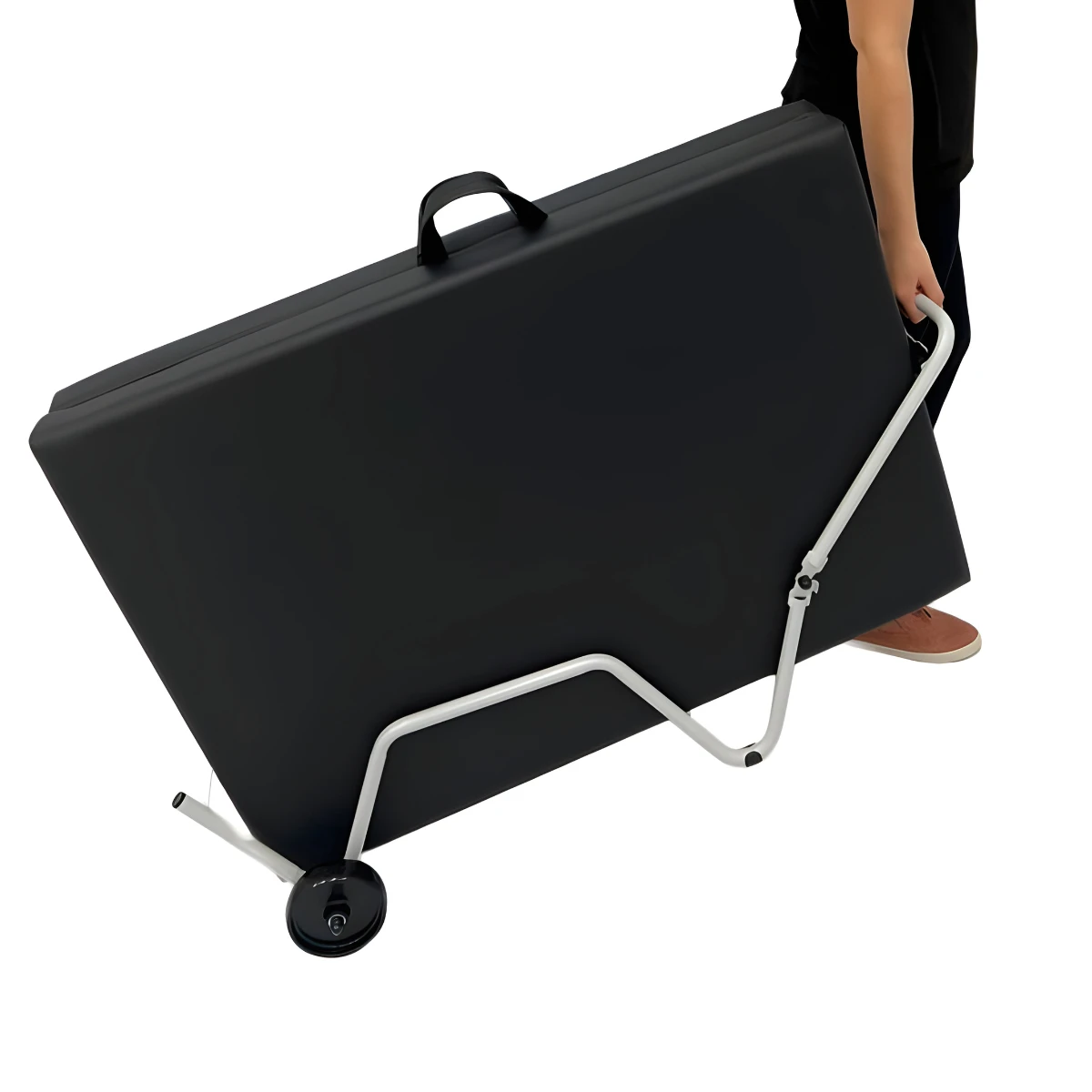 Pensada para profesionales que realizan atenciones domiciliarias o necesitan movilidad, la camilla se pliega fácilmente y se transforma en una maleta compacta en segundos gracias a su sistema de cierre metálico reforzado y asa lateral resistente.